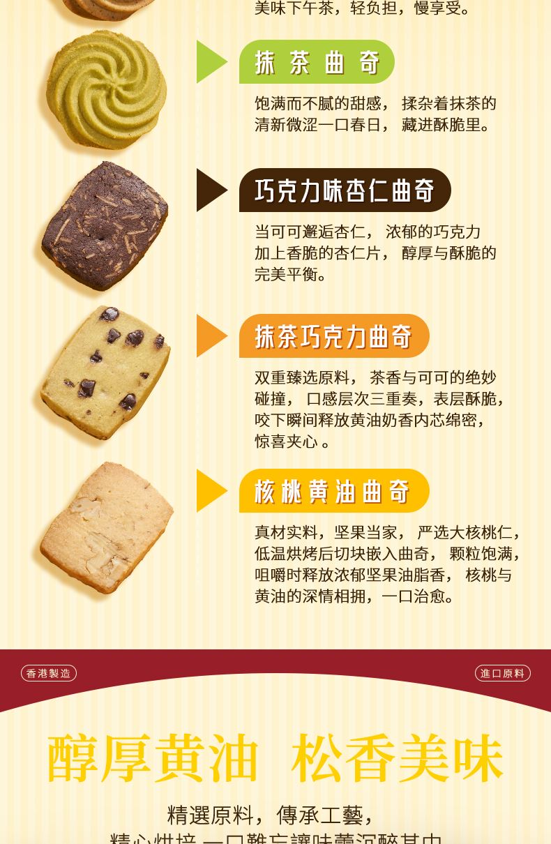 香港小熊,主打健康,美味,用心,產(chǎn)品覆蓋了小熊曲奇,蛋卷王,鳳梨酥,脆片,雪花酥,牛軋?zhí)堑?0-50款。產(chǎn)品大多選用進(jìn)口黃油,可可,抹茶粉等優(yōu)質(zhì)原材料,打造0添加健康食品,口感細(xì)膩濃郁,層次豐富回味無窮。包裝方面,涵蓋了鐵盒,精致透明盒,節(jié)慶特色禮盒等多系列。