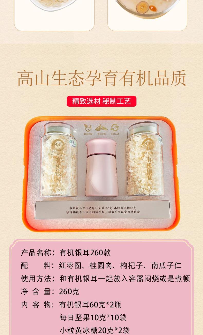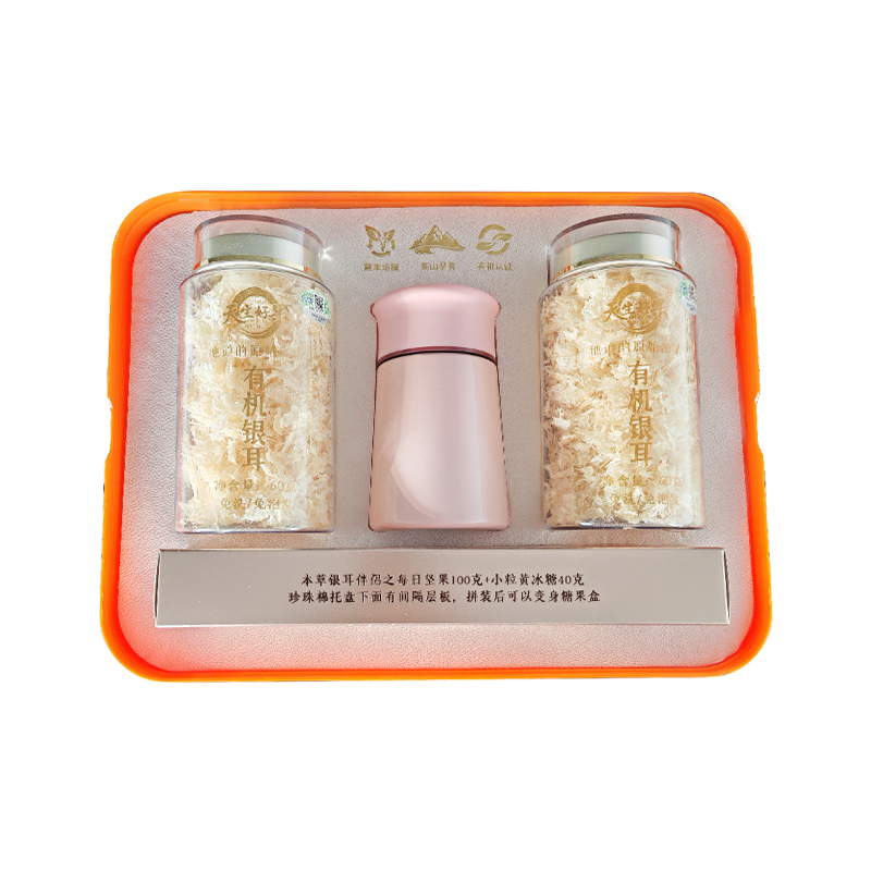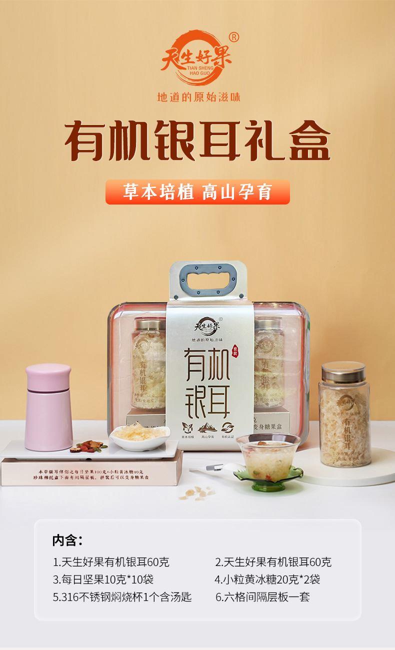 彩盒尺寸:340*108*250mm 產(chǎn)品規(guī)格:260克 內(nèi)配: 1.天生好果有機(jī)銀耳60克 2.天生好果有機(jī)銀耳60克 3.每日?qǐng)?jiān)果10克*10袋 4.小粒黃冰糖20克*2袋 5.316不銹鋼燜燒杯1個(gè)含湯匙 6.六格間隔層板一套