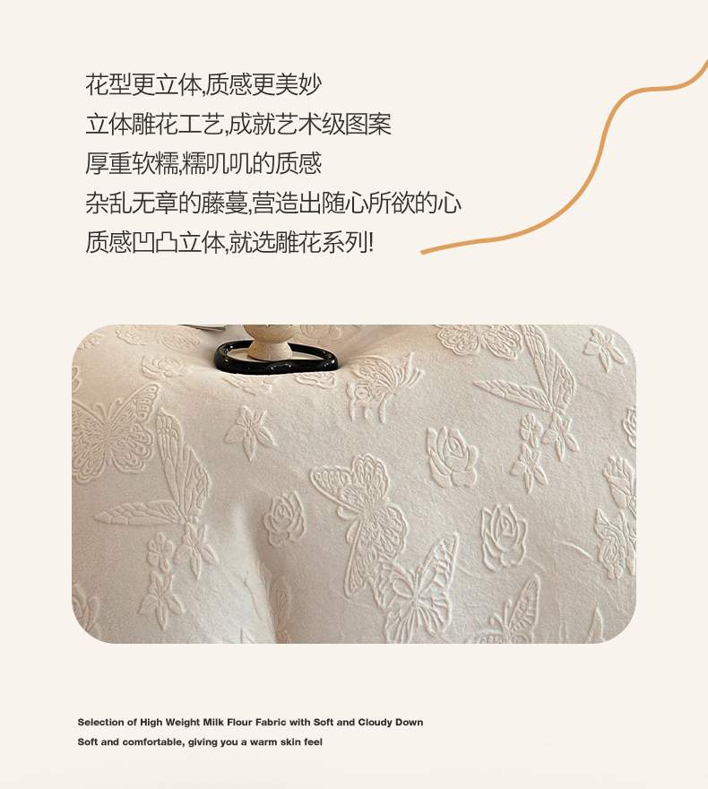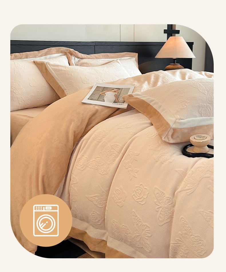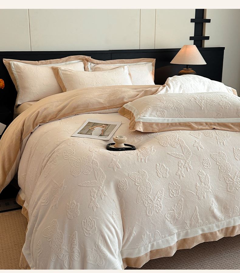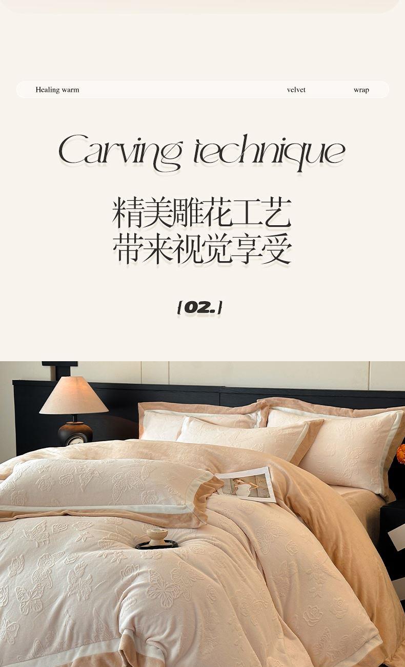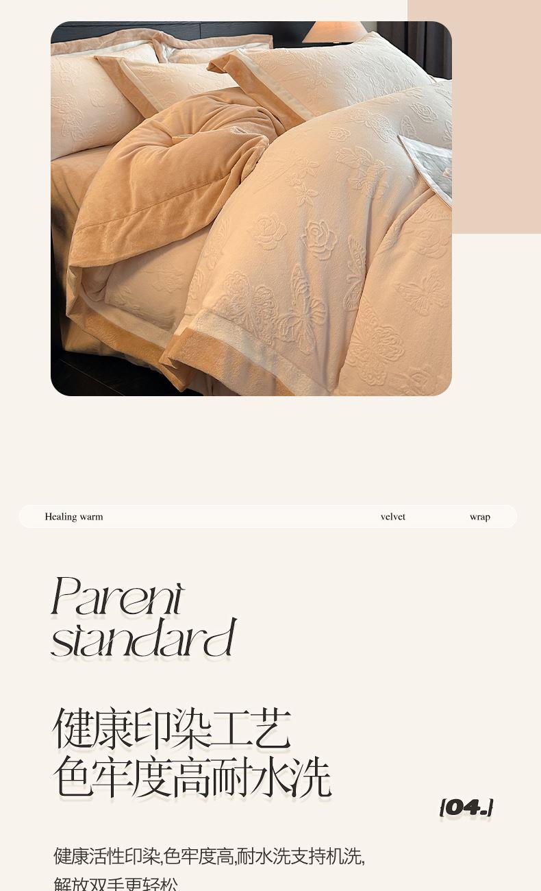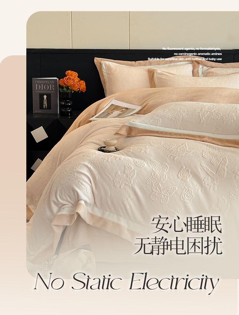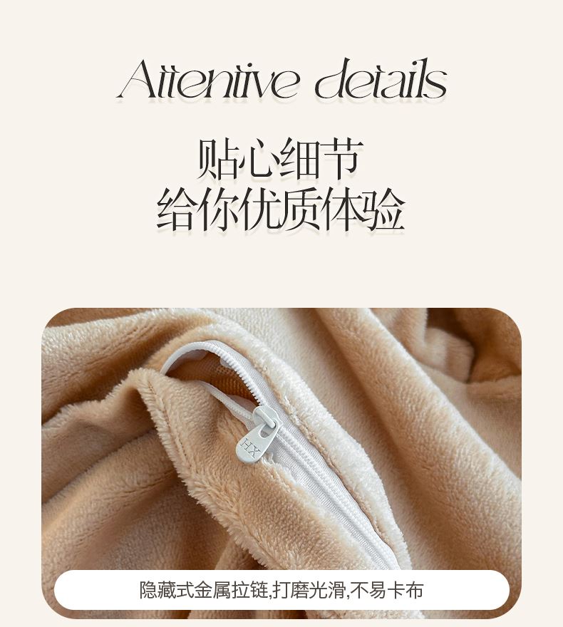 被套:200×230cm 床單:245×245cm 枕套:48×74cm 適用:1.5M-1.8M床 面料:牛奶絨(抗靜電) 款式:寬邊 風(fēng)格 : 輕奢風(fēng)格 套件采用高克重全消光?;ńq面料,24H保暖呵護(hù)整夜溫暖,柔軟細(xì)膩,貼膚保暖,面料植入導(dǎo)電絲,免去靜電煩惱,溫暖整個(gè)冬季。