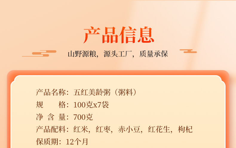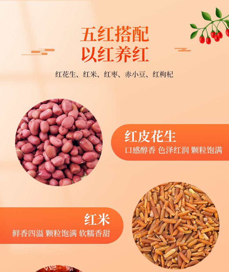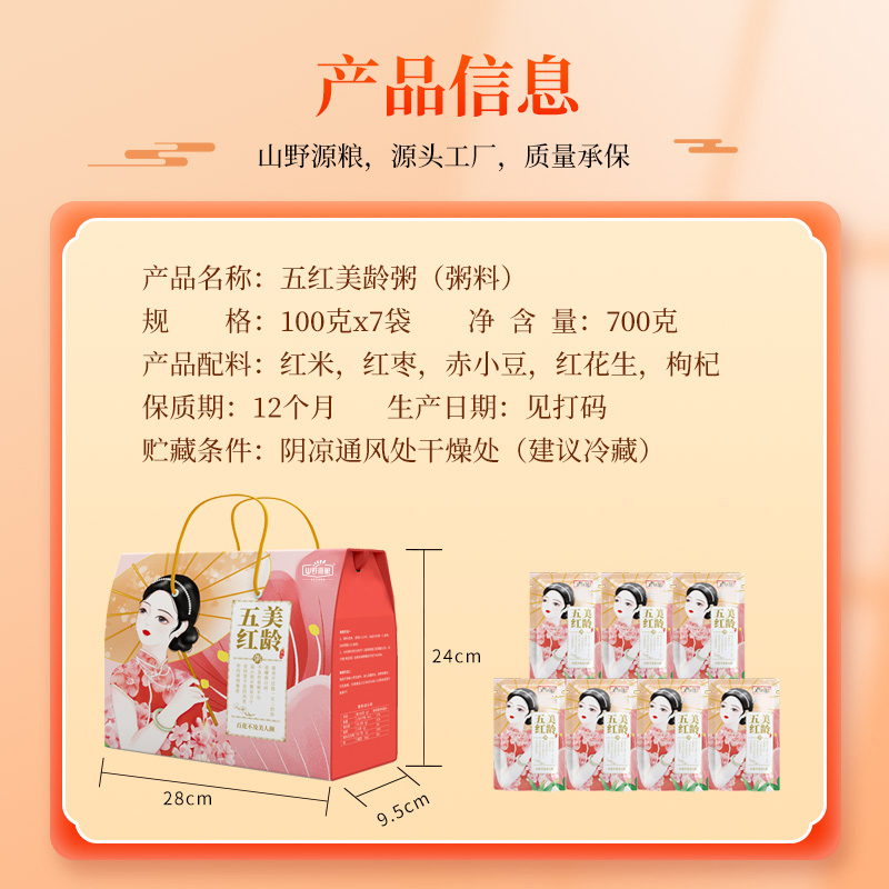 規(guī)格:100g*7( 0.7kg) 配料:紅花生、紅米、紅棗、赤小豆、紅枸杞 盒尺寸:屋頂28*9.5*24 箱重量:屋頂15.53kg 箱尺寸:屋頂裝58*40*50(0.116方)
