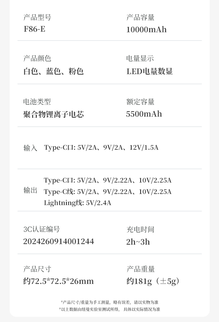 Type-C口輸入:5V/2A;9V/ 2.22A;10V /2.25A