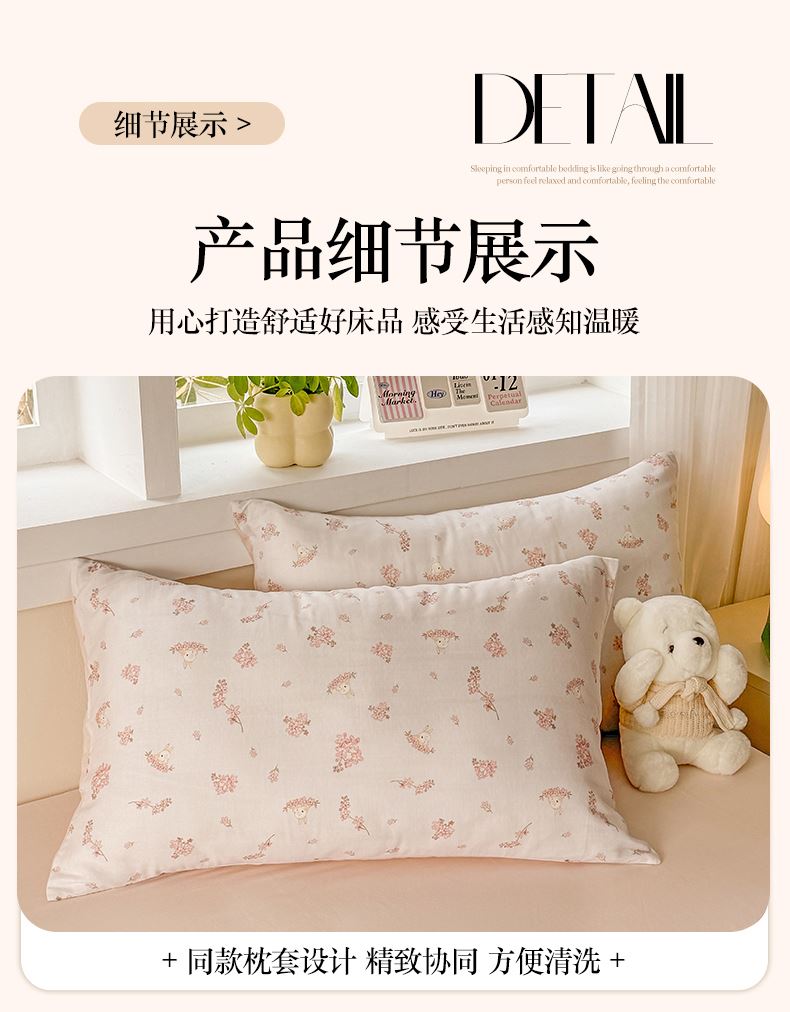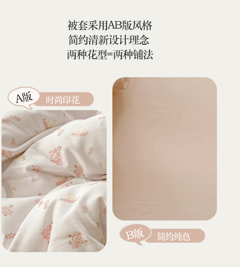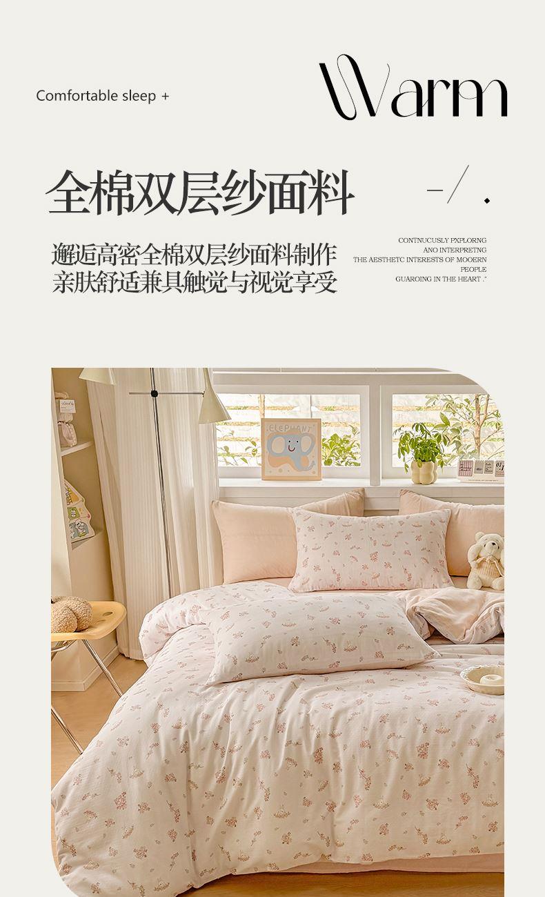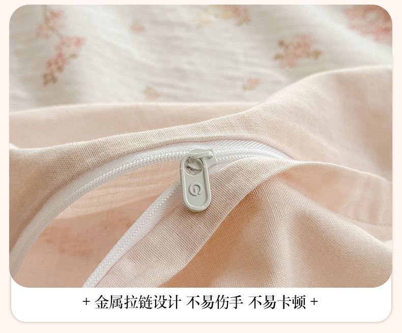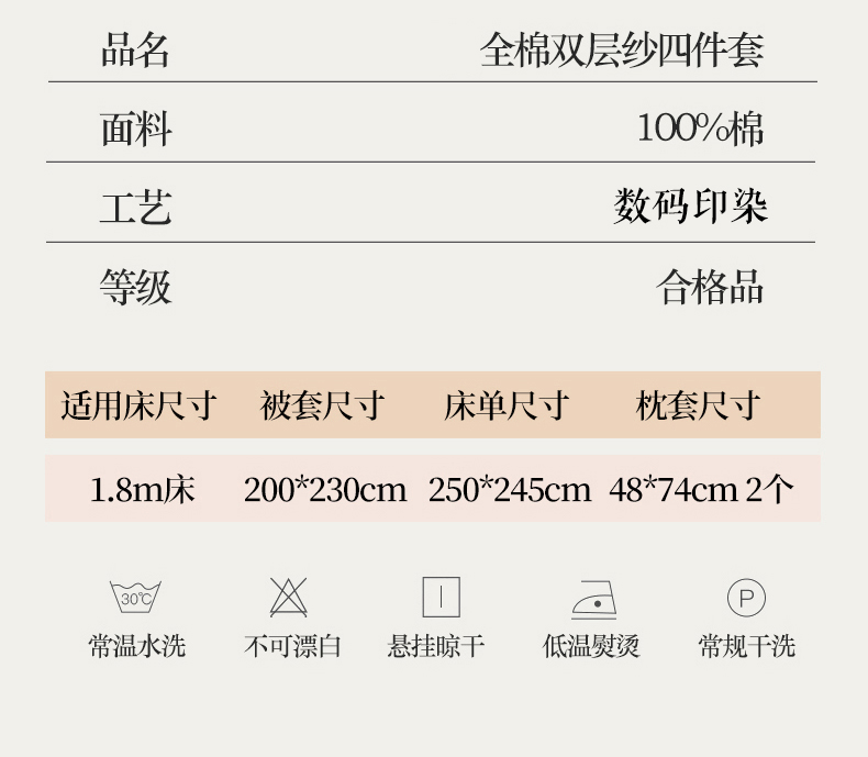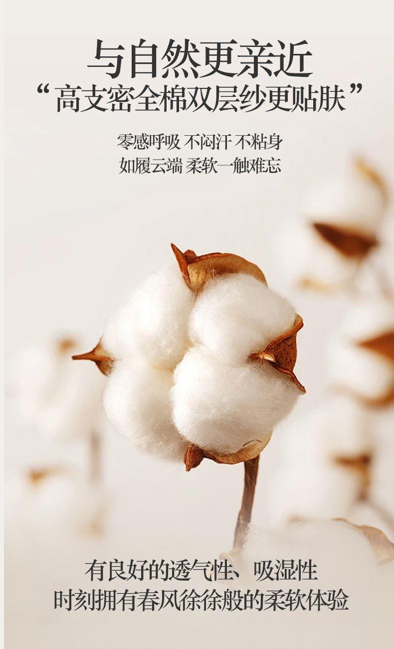 被套:200×230cm 床單:245×245cm 枕套:48×74cm 適用:1.5M-1.8M床 面料:雙層紗(全棉) 全棉雙層紗面料 邂逅高密全棉雙層紗面料制作親膚舒適兼具觸覺(jué)與視覺(jué)享受,有良好的透氣性、吸濕性時(shí)刻擁有春風(fēng)徐徐般的柔軟體驗(yàn)。