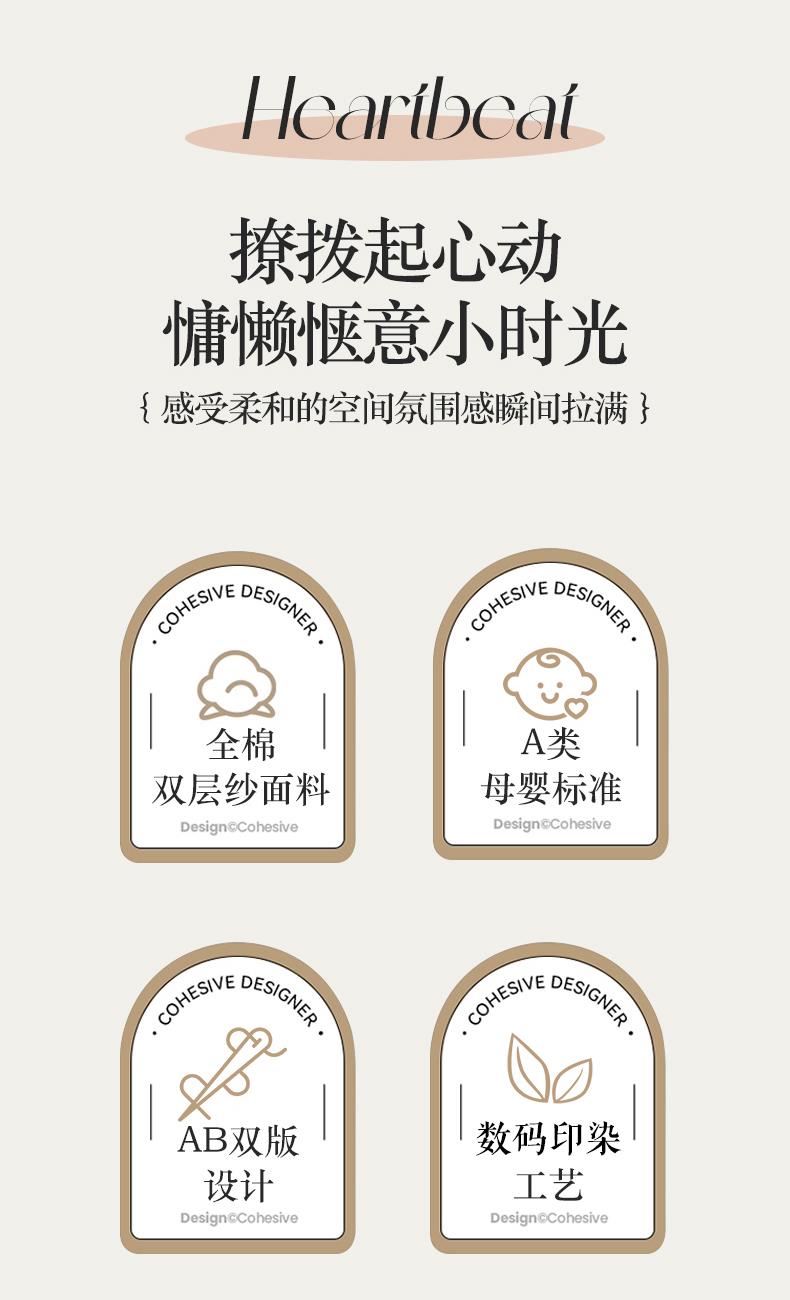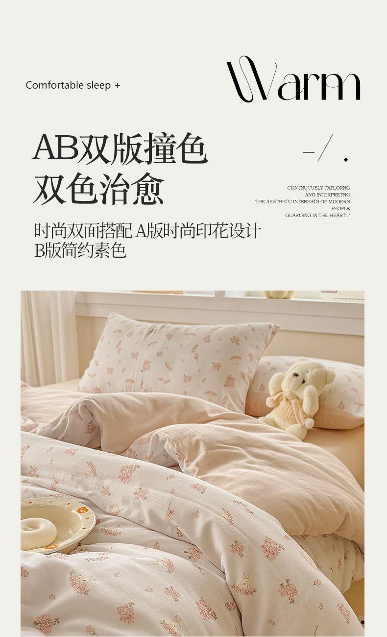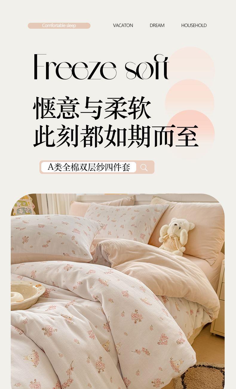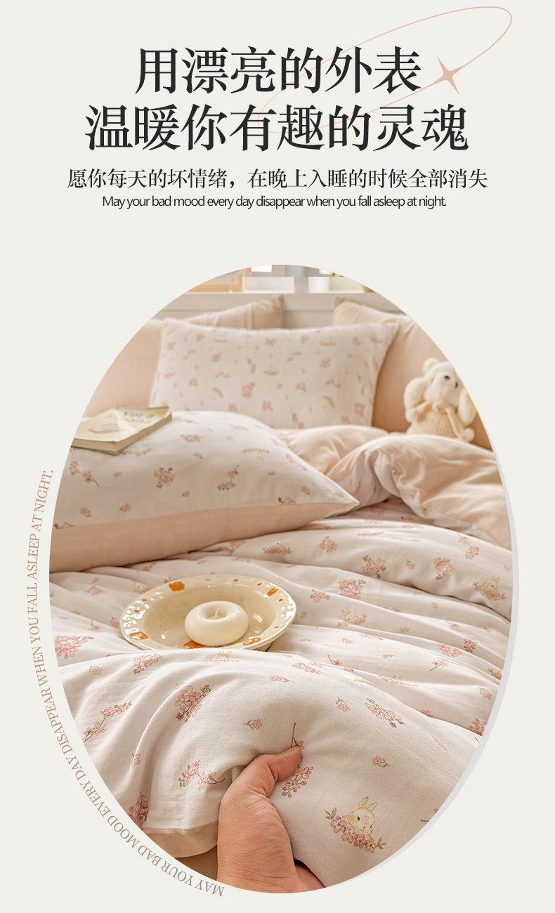 被套:200×230cm 床單:245×245cm 枕套:48×74cm 適用:1.5M-1.8M床 面料:雙層紗(全棉) 全棉雙層紗面料 邂逅高密全棉雙層紗面料制作親膚舒適兼具觸覺(jué)與視覺(jué)享受,有良好的透氣性、吸濕性時(shí)刻擁有春風(fēng)徐徐般的柔軟體驗(yàn)。